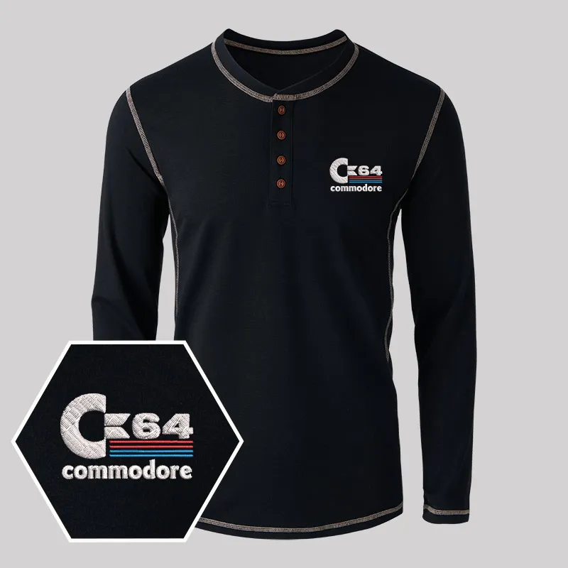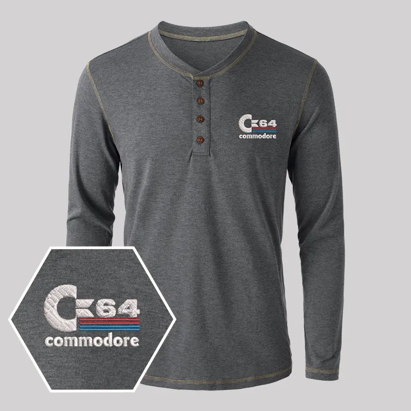 C64 Embroidered Long Sleeve Henley Shirts