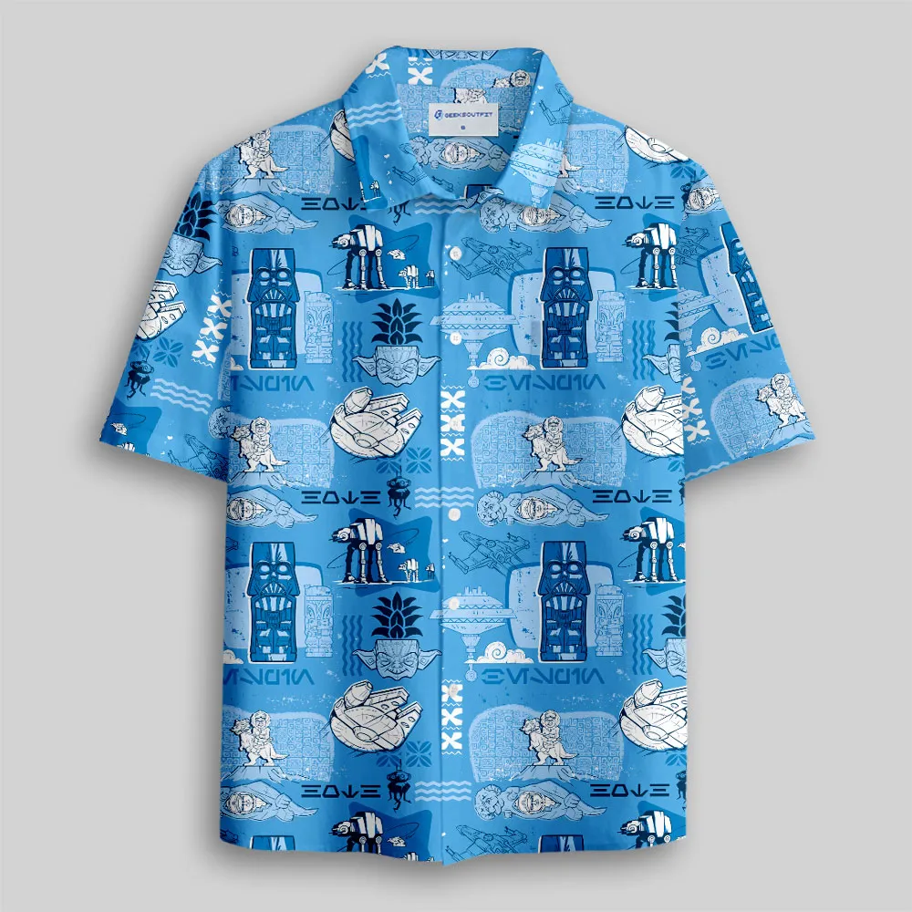 Hawaiian Traditional Tiki Blue Button Up Pocket Shirt