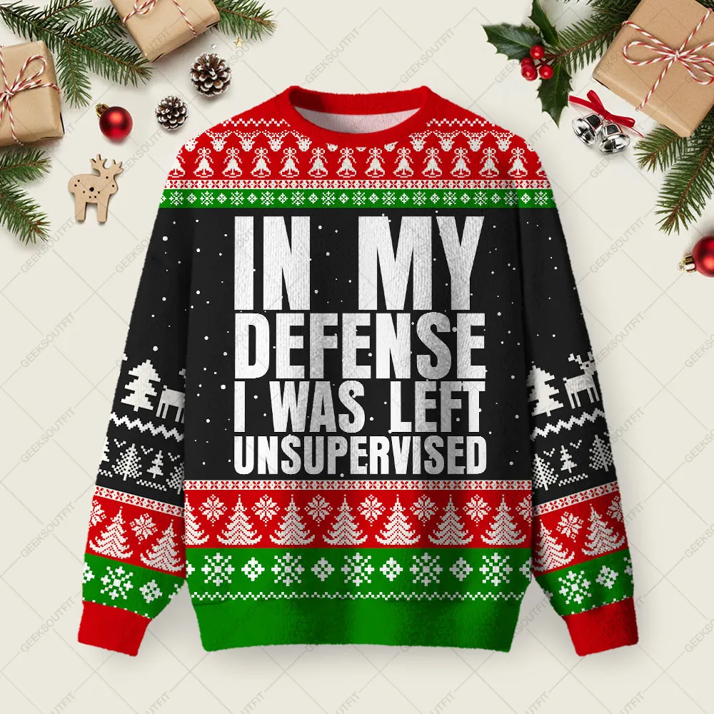 In My Defense I Was Left Unsupervised Ugly Christmas Fuzzy Fleece Sweatshirt