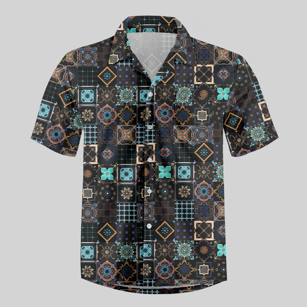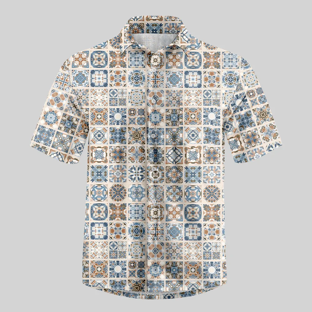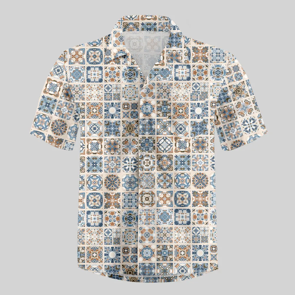 Portuguese Retro Tile Pattern Button Up Pocket Shirt