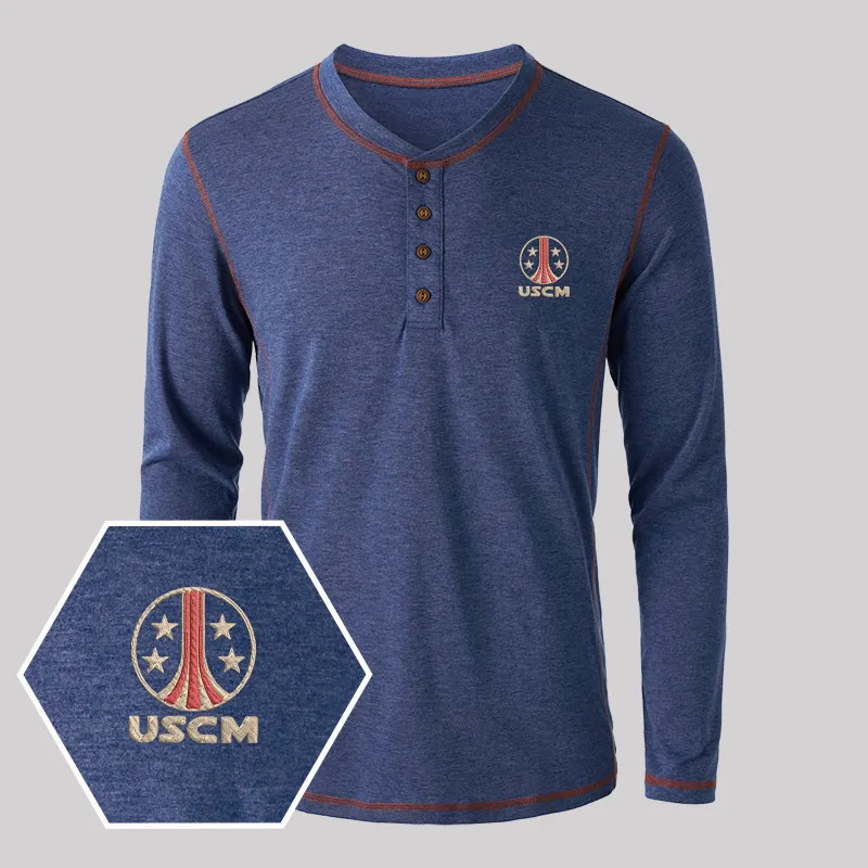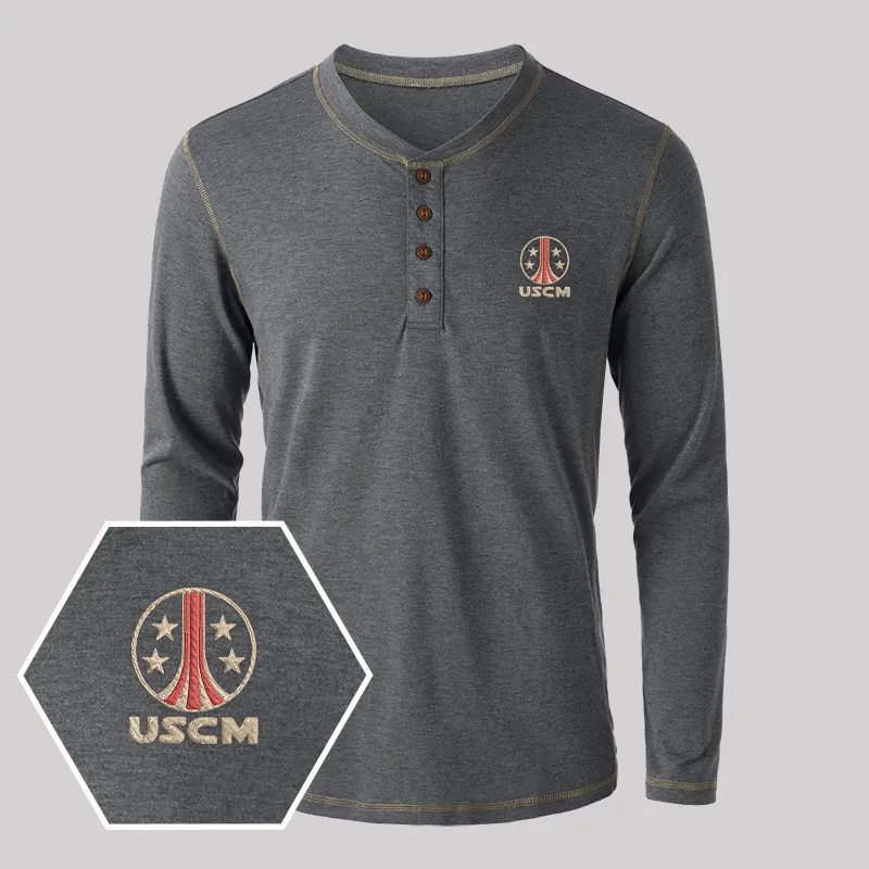 USCM Geek Embroidered Long Sleeve Henley Shirts